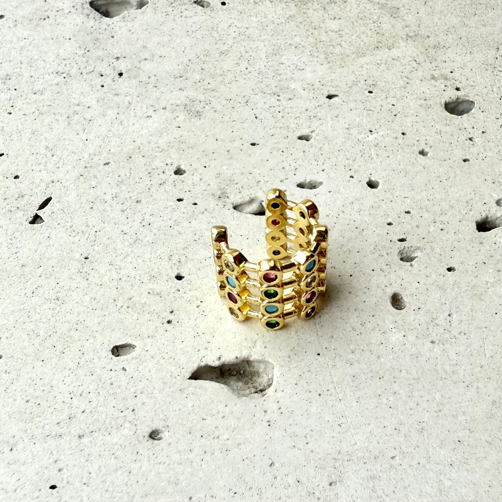 Este Earcuff presenta un diseño en 4 lineas delgadas acompañas de circones de colores que te aportan un toque vibrante y elegante en el look . Su diseño ajustable garantiza comodidad y seguridad, es perfecto para quien busca un accesorio versátil sin necesidad de perforarse.