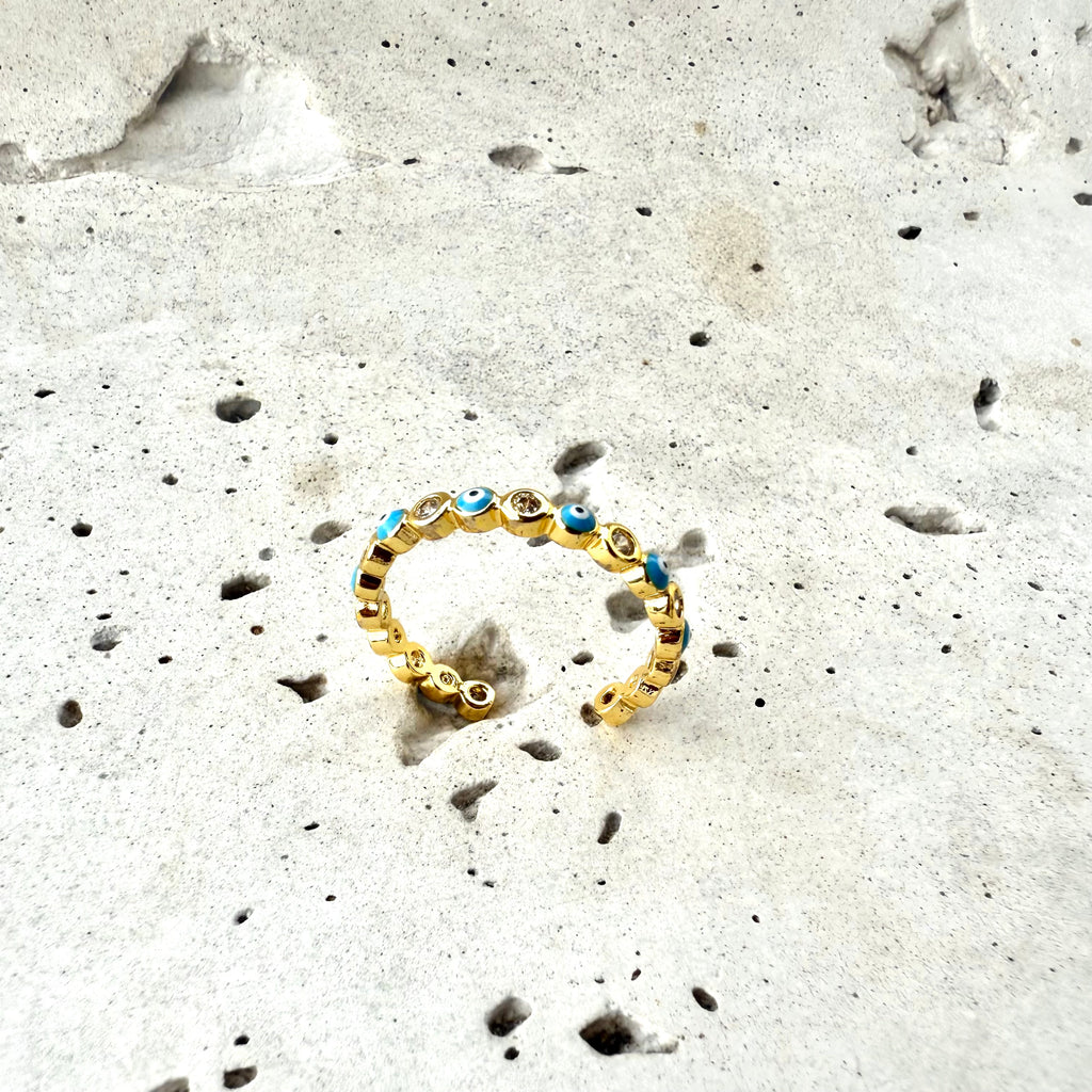 Anillo con diseño de ojo turco 🧿 y circones elaborado en una aleación de metales bañado en rodio. Es ajustable lo que garantiza comodidad y versatilidad para cualquier tamaño de dedo. Lleva contigo un símbolo de buena energía con un toque moderno que no pasará desapercibido.