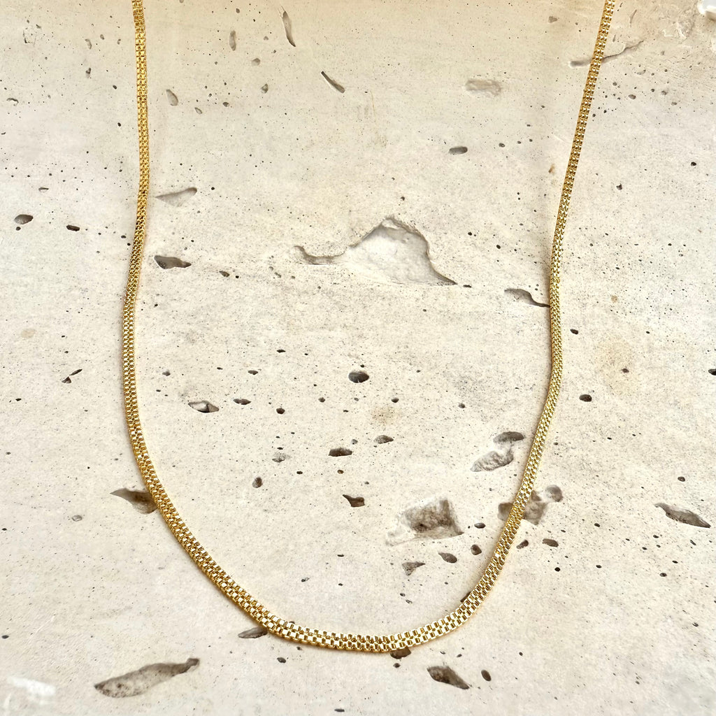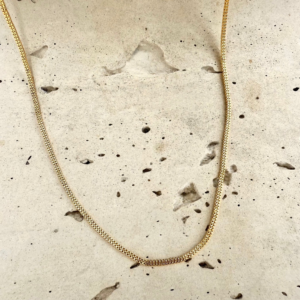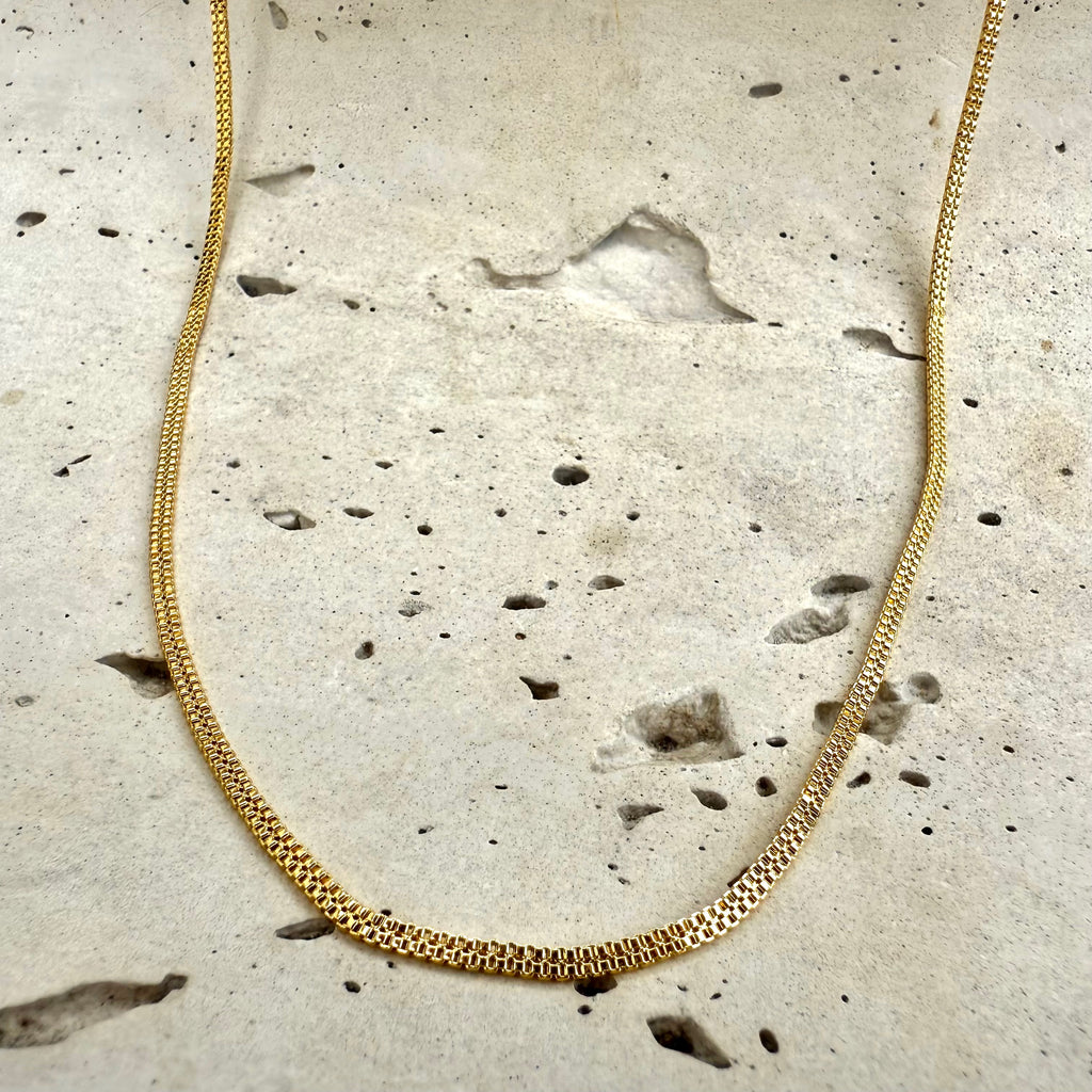 Esta cadena con un diseño plano y doble es delgada y liviana te ofrece comodidad y estilo. Siendo un accesorio sutil y resistente que te sirve para complementar cualquier atuendo con facilidad.