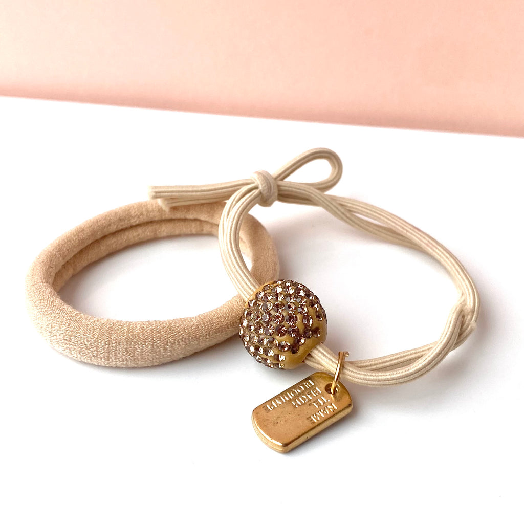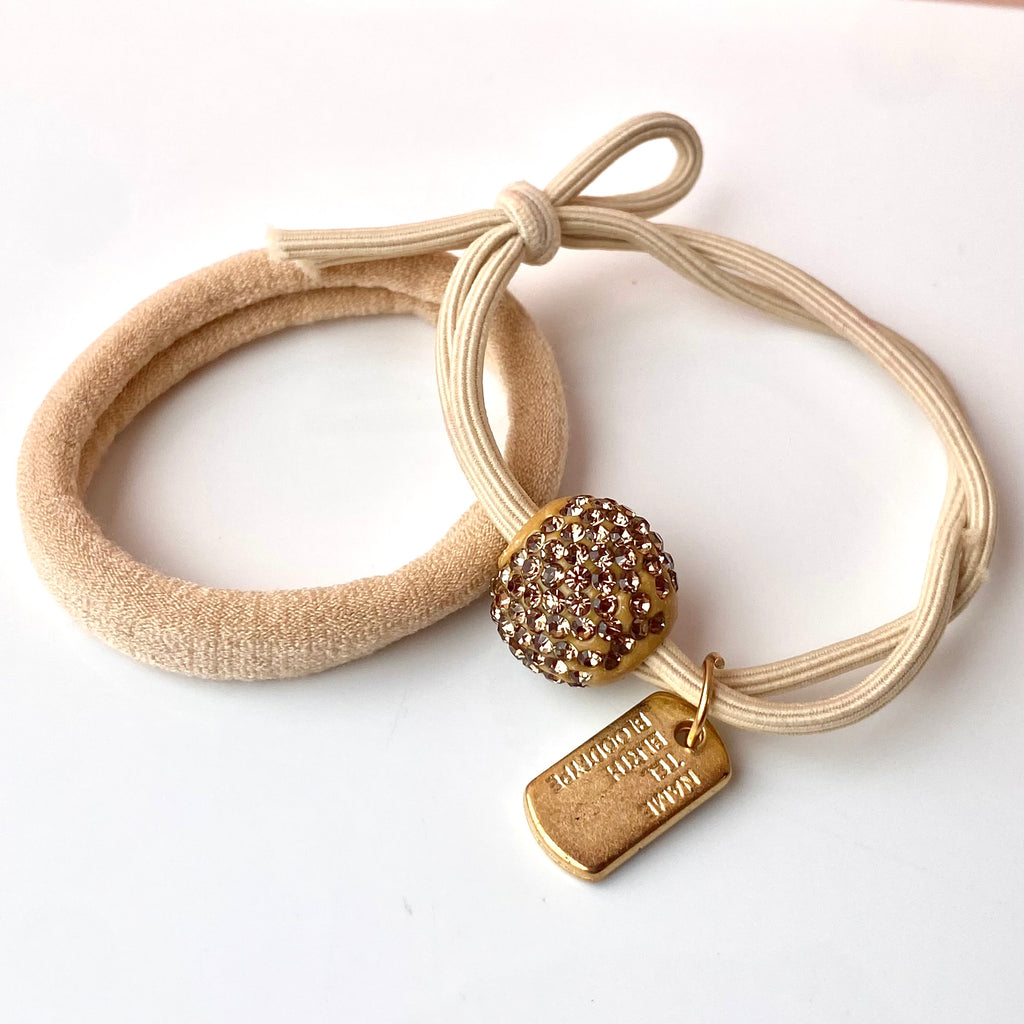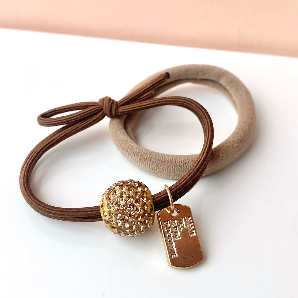 Set de colores x 2 unidades en elástico grueso café con una bola de fuego con brillantes decorativa.