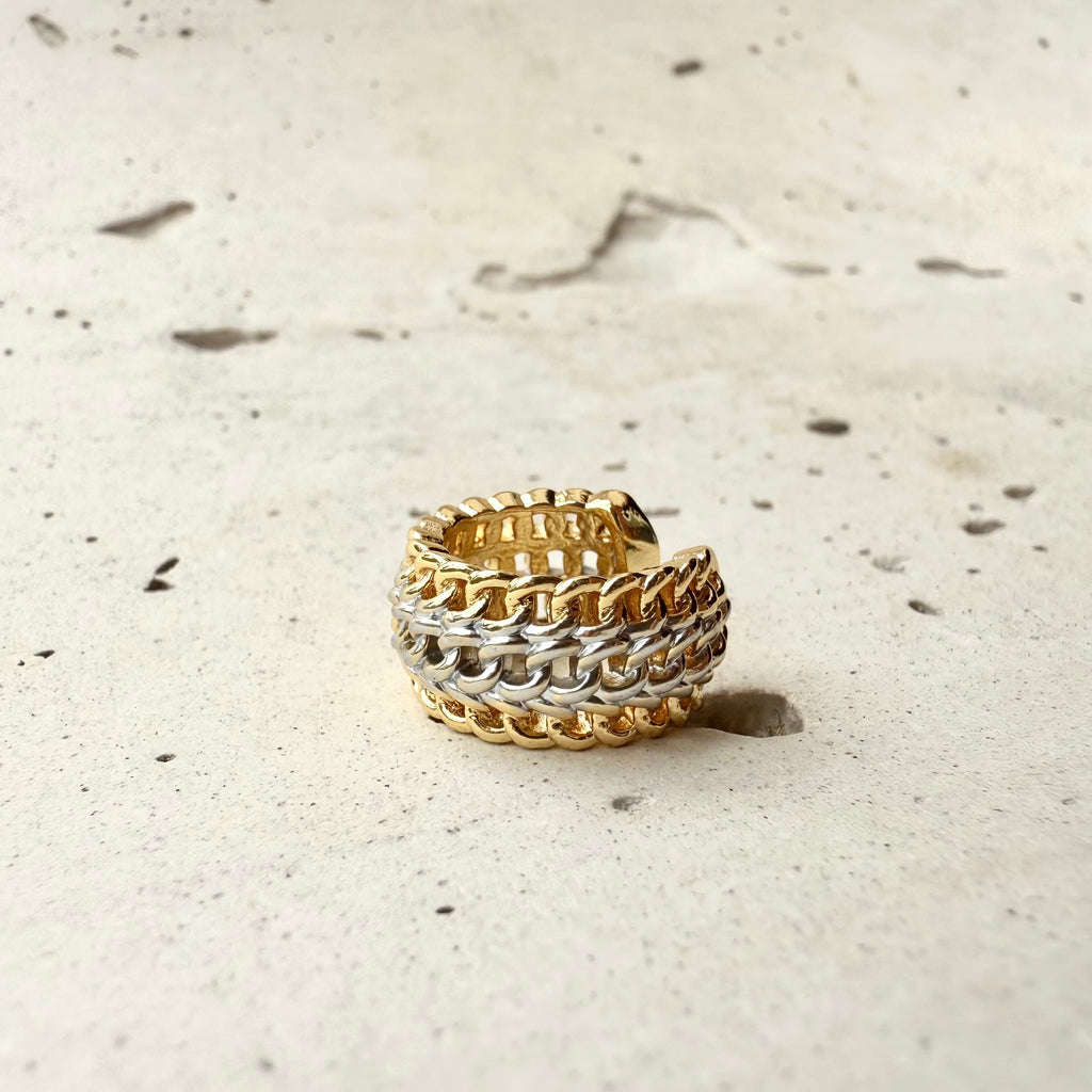 Este earcuff combina delicadamente cadenas en dorado y plateado, ofreciéndote un estilo versátil y arriesgado. Su diseño te permite mezclar fácilmente con diferentes accesorios. Es ideal para quien busca destacar con elegancia y originalidad.