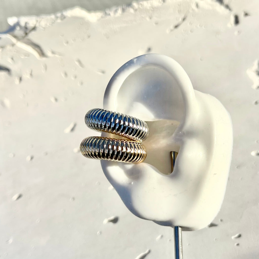 Earcuff mediano con franjas dando diseño de caparazón de un caracol, al estar abrazando la oreja se verá muy llamativo y moderno.