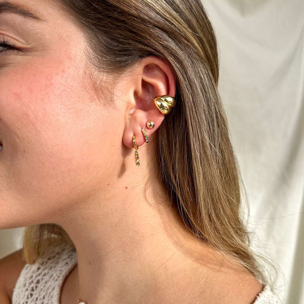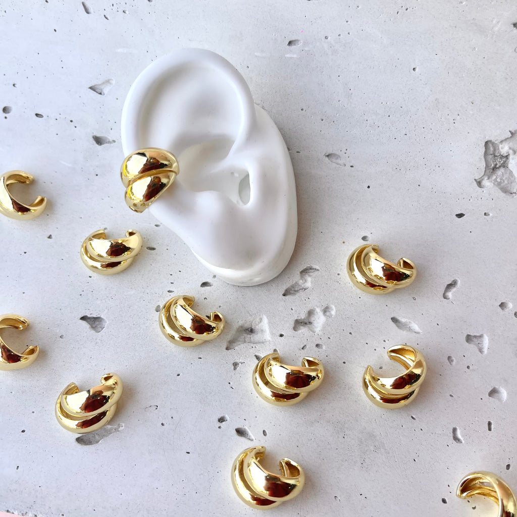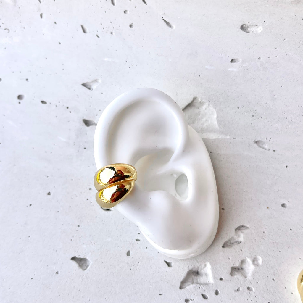 Earcuff dorado con diseño de dos gotas alargadas abrazando tu oreja.