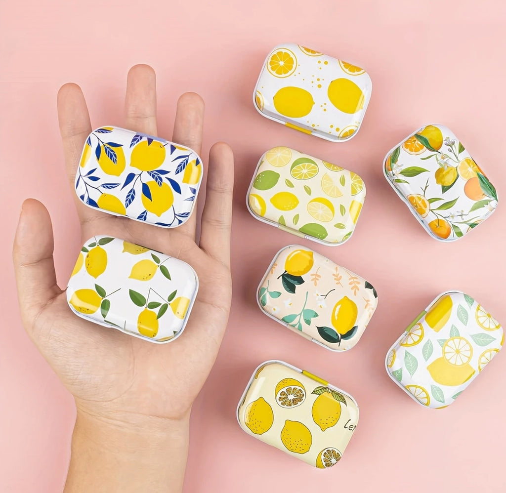 Esta caja metálica con diseño de limón es perfecta para guardar pequeños objetos como charms, mentas o cualquier detalle que desees proteger. Su tamaño compacto y cierre seguro la hacen ideal para mantener tus accesorios organizados y al alcance, combinando funcionalidad con un estilo fresco y original.