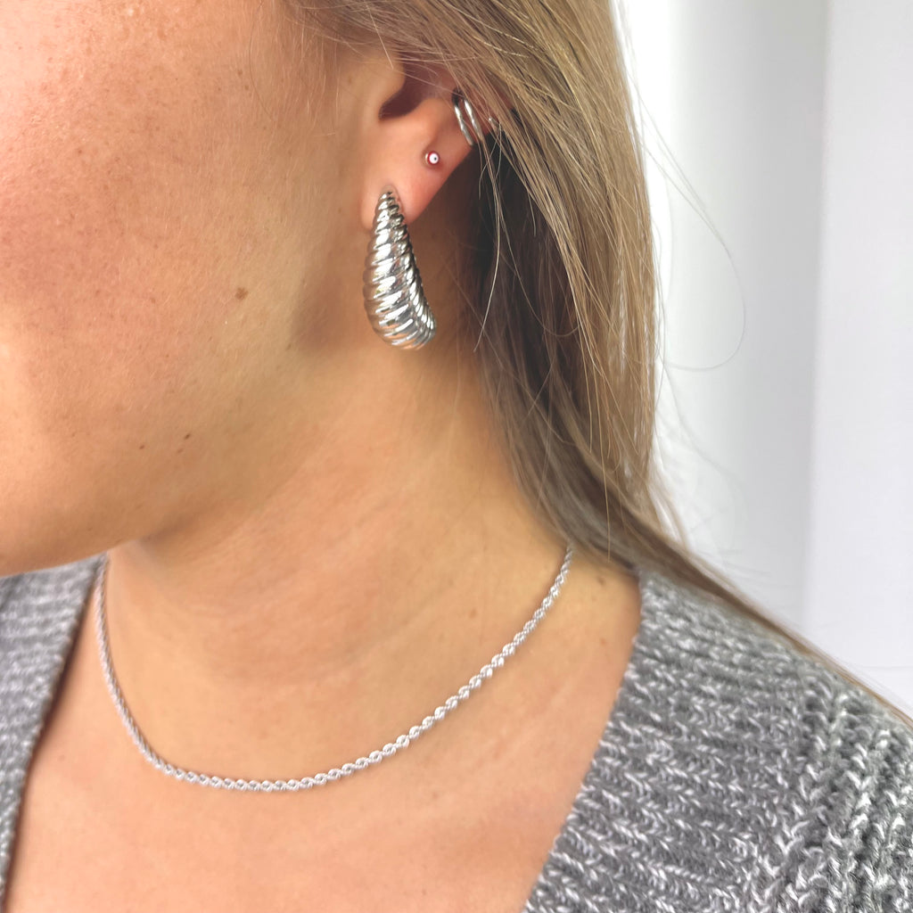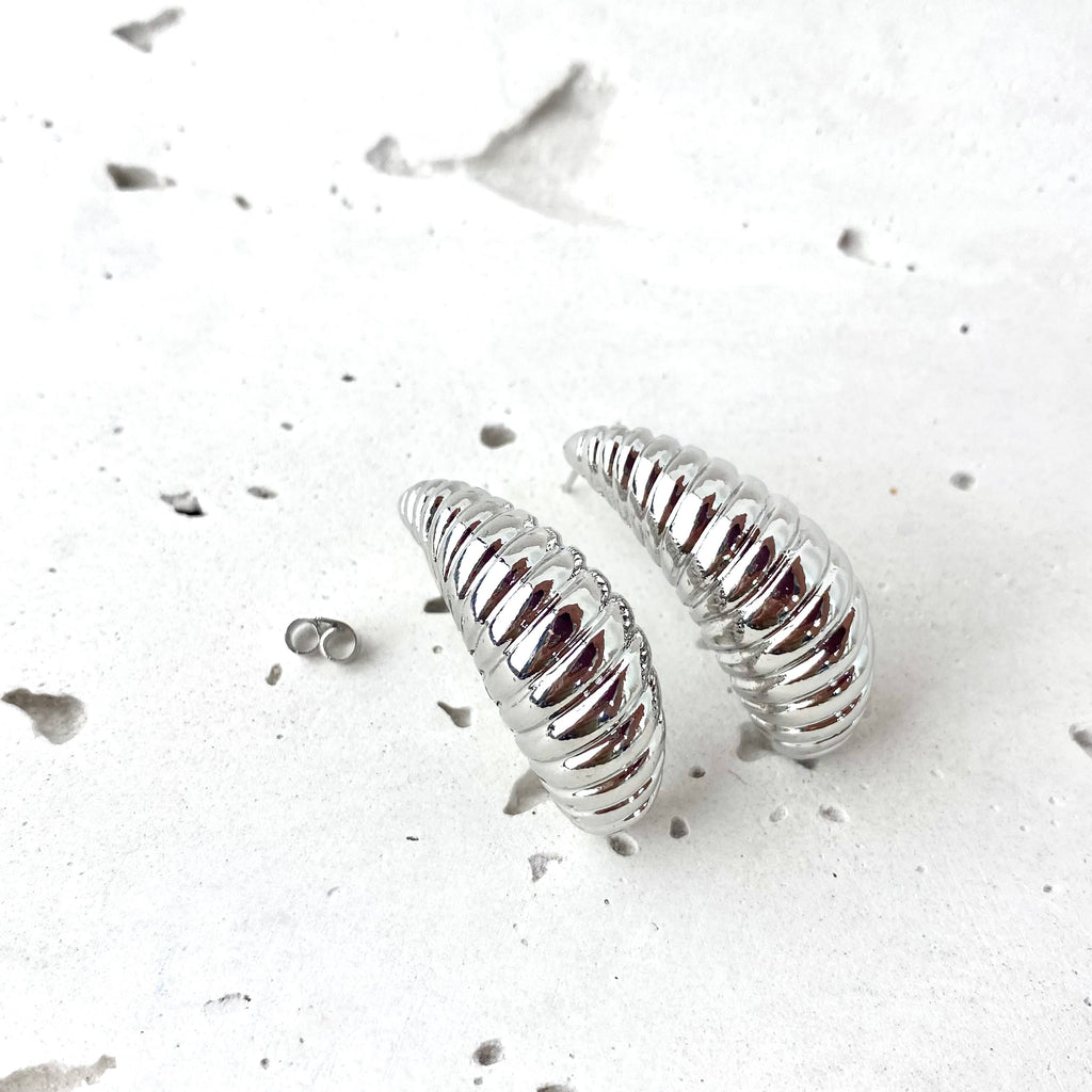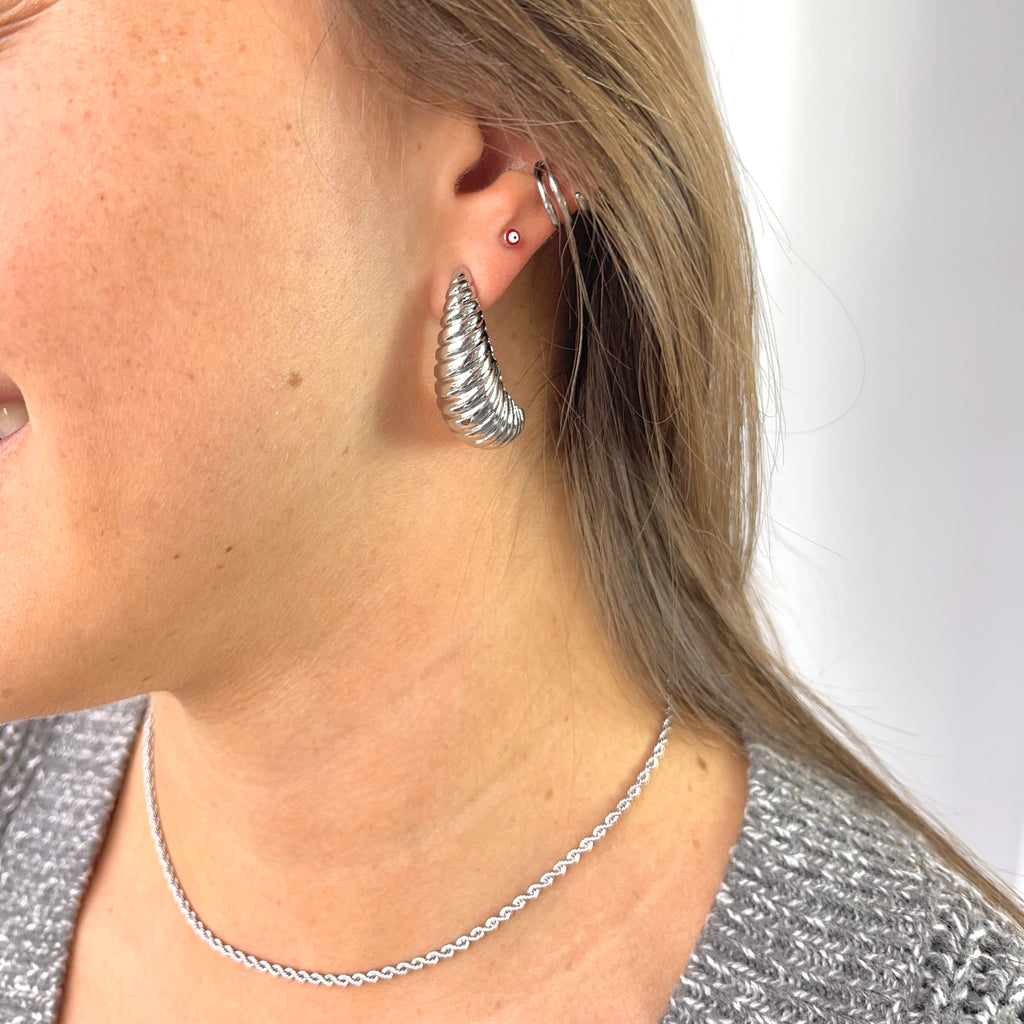 Aretes Chunky de media luna plateados con textura estriada y acabado brillante. Diseño de moda 'Croissant' voluminoso. ¡Pieza statement esencial para tu joyero!