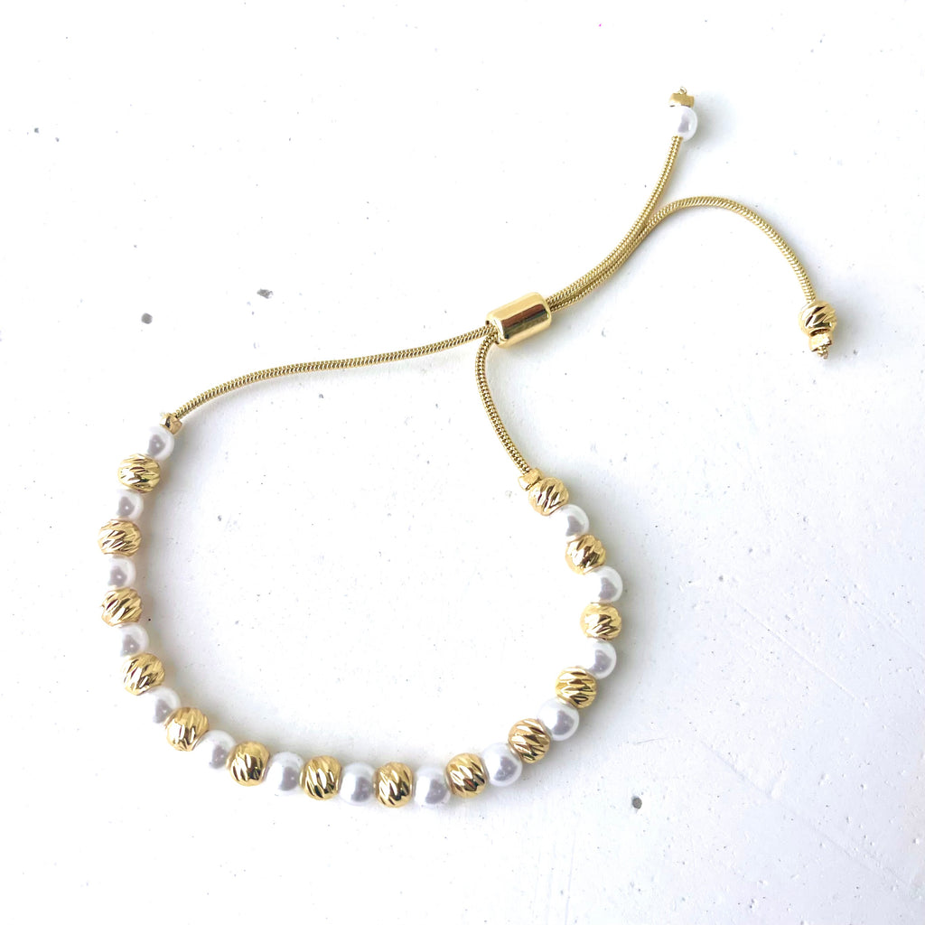 Pulseras en perlas sintéticas en un lateras el el otro de balines dorados de 5mm, con dije central de oración padre nuestro.