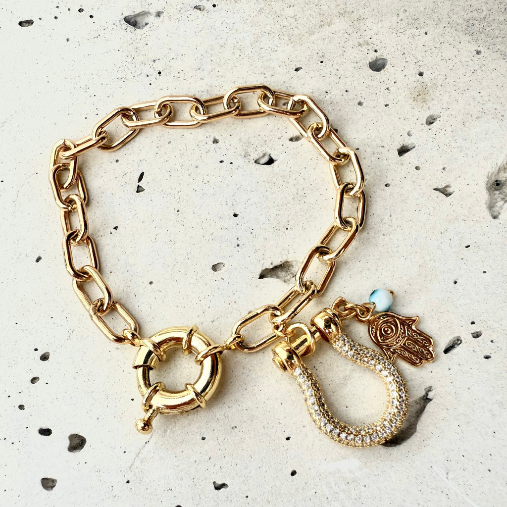 Pulseras en perlas sintéticas intercaladas con ojo turco y dije en Herradura con brillantes y mano Hamsa