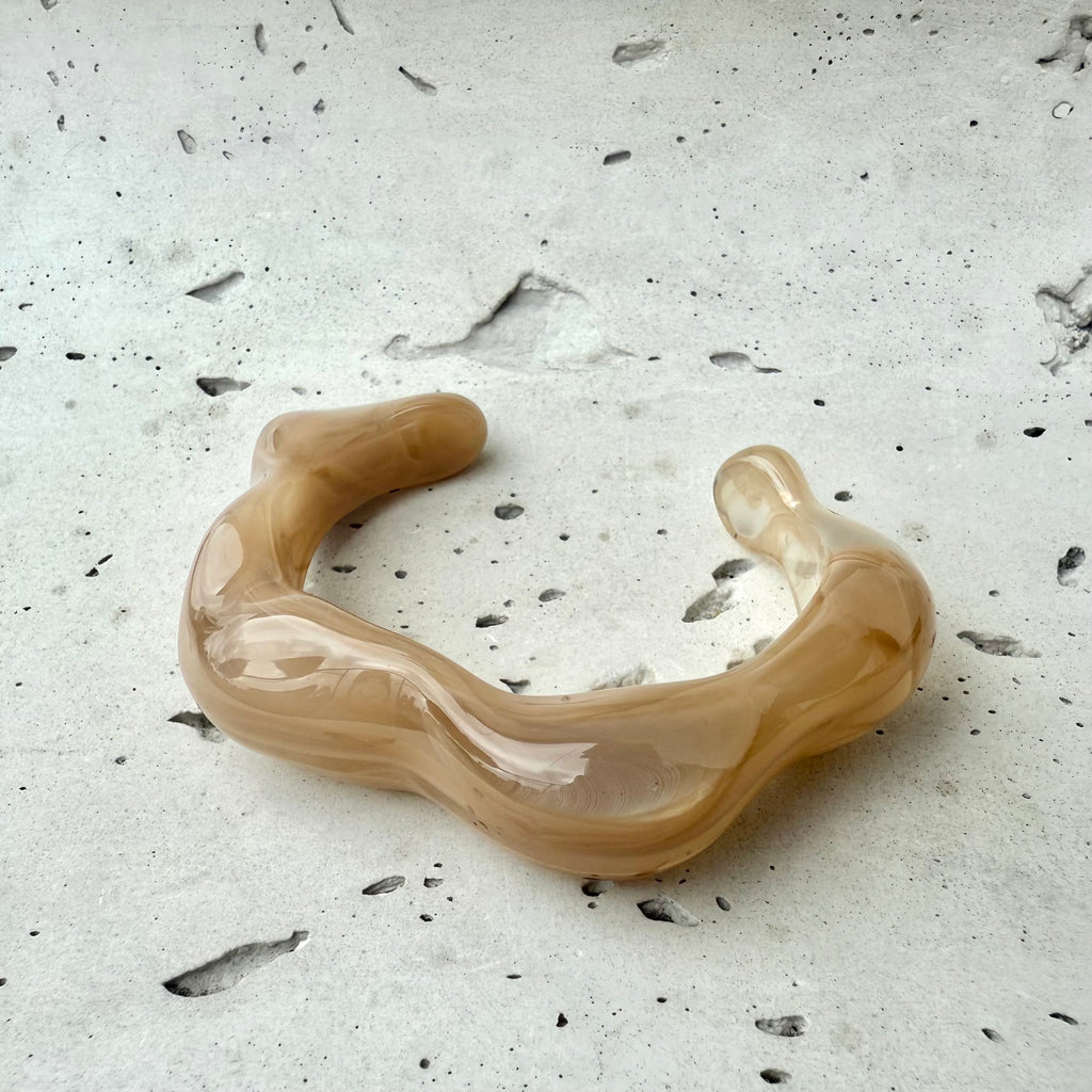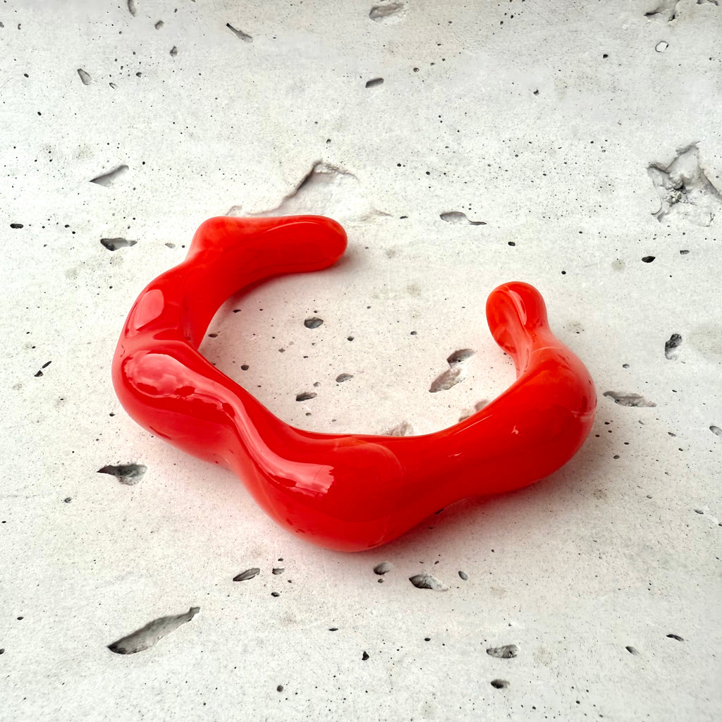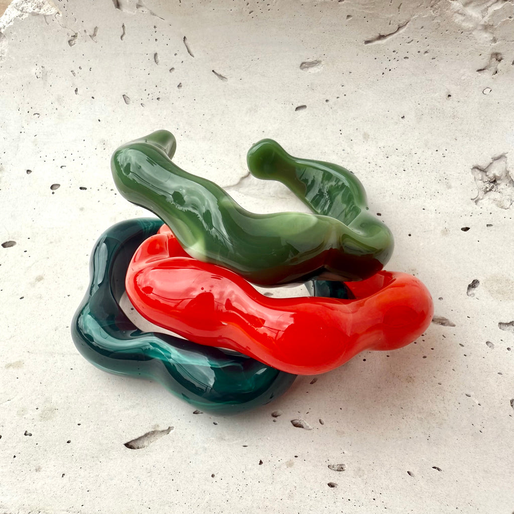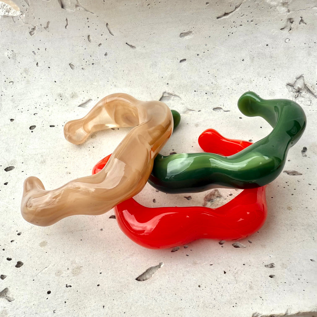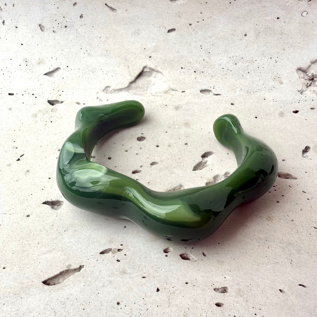 Brazalete rígido verde esmeralda de acrílico o resina. Pulsera bold y escultórica de moda, con diseño ondulado, ideal para looks de verano y tendencia.