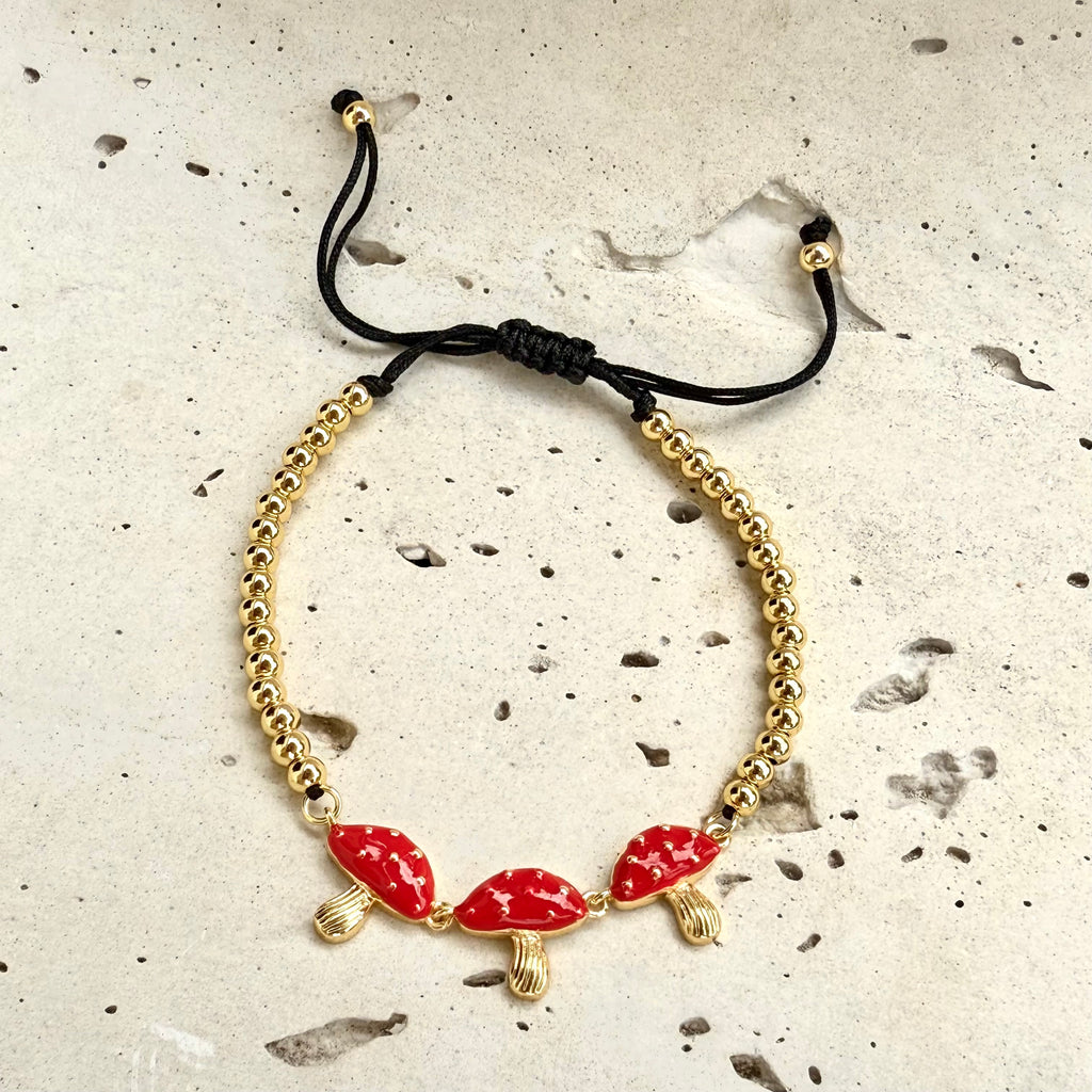 Esta pulsera de hilo negro y balines dorados destaca por sus tres hongos 🍄 en el centro, un detalle que aporta un toque único y natural, su diseño sencillo la hace perfecta para usar a diario siendo una accesorio discreto pero con personalidad.