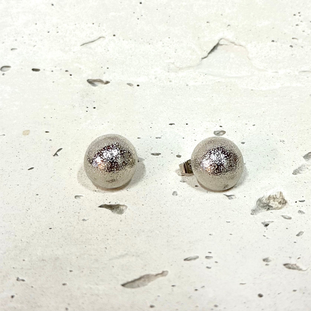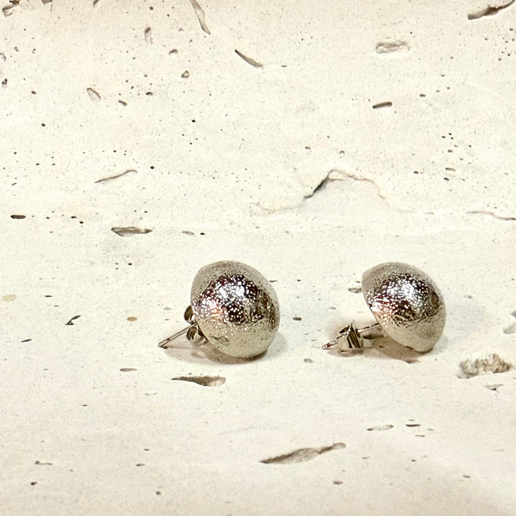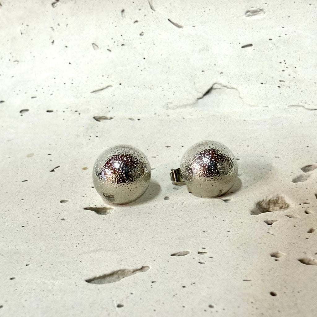 Aretes de botón esféricos plateados con acabado texturizado 'martillado'. Joyería Statement bold, perfecta para elevar cualquier look de día o noche.